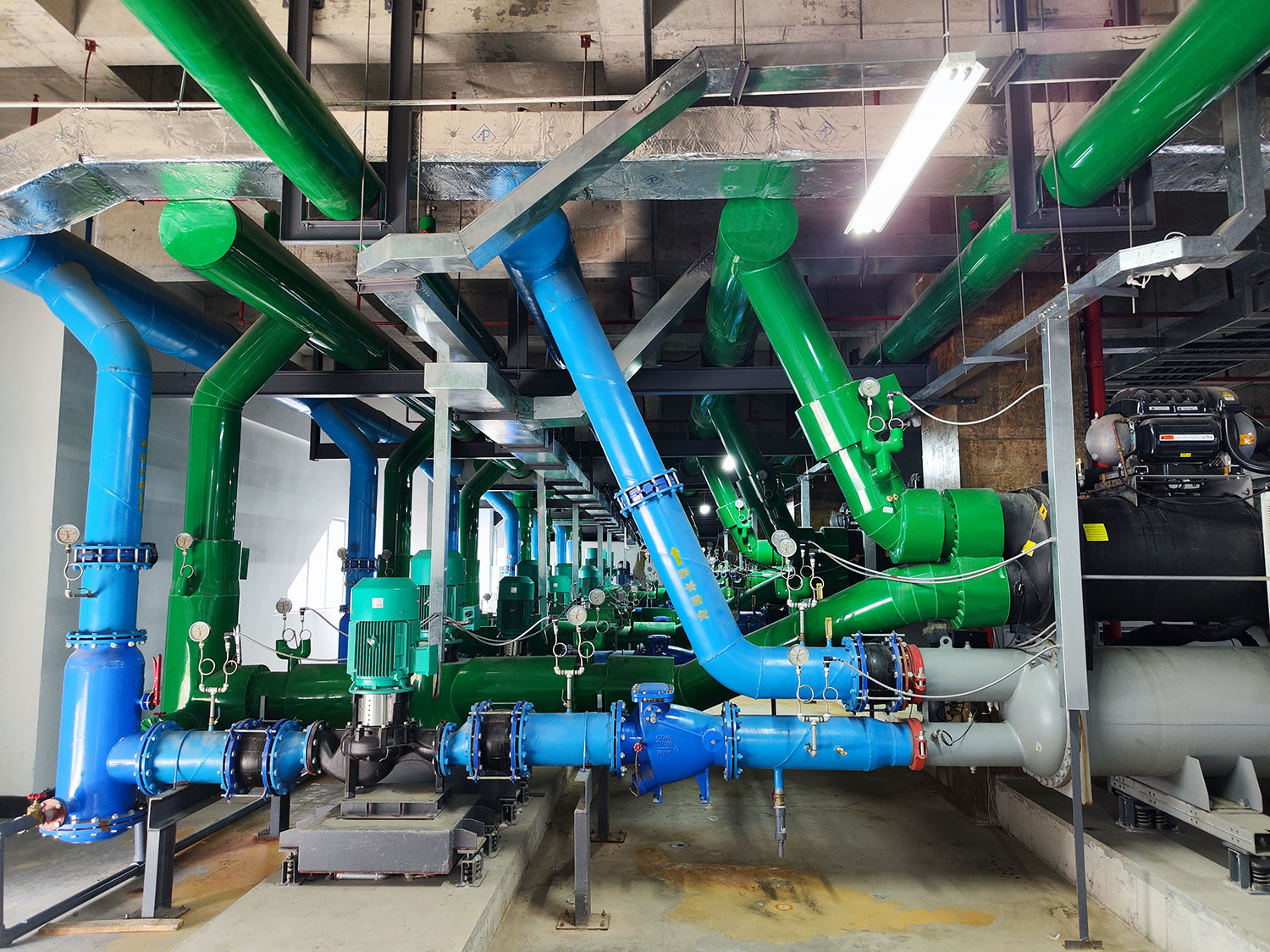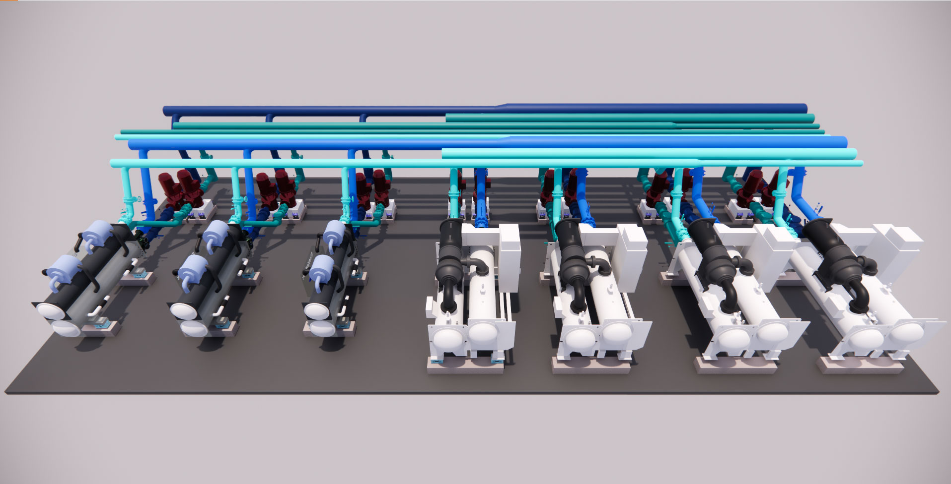 水泵与主机一对一连接有利于主机之间的流量平衡,对比传统共用集管的方式,节省电动阀投资,简化控制环节;