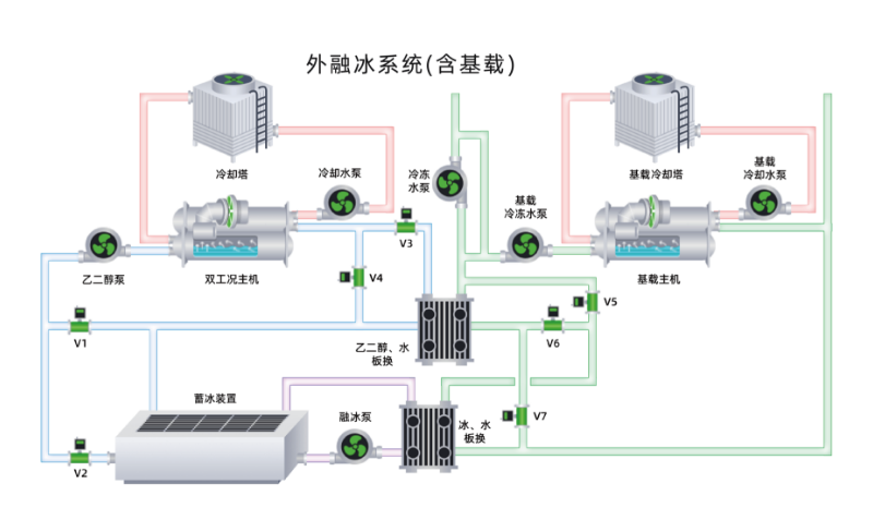 蓄冰系统需要通过载冷剂来传送冷量,载冷剂的冰点需要低于水的冰点,以便在制冰时仍能传送冷量。最常用的载冷剂是在水中添加防冻剂来降低其冰点,在乙二醇蓄冰系统中防冻剂一般采用浓度为25%的乙烯乙二醇。