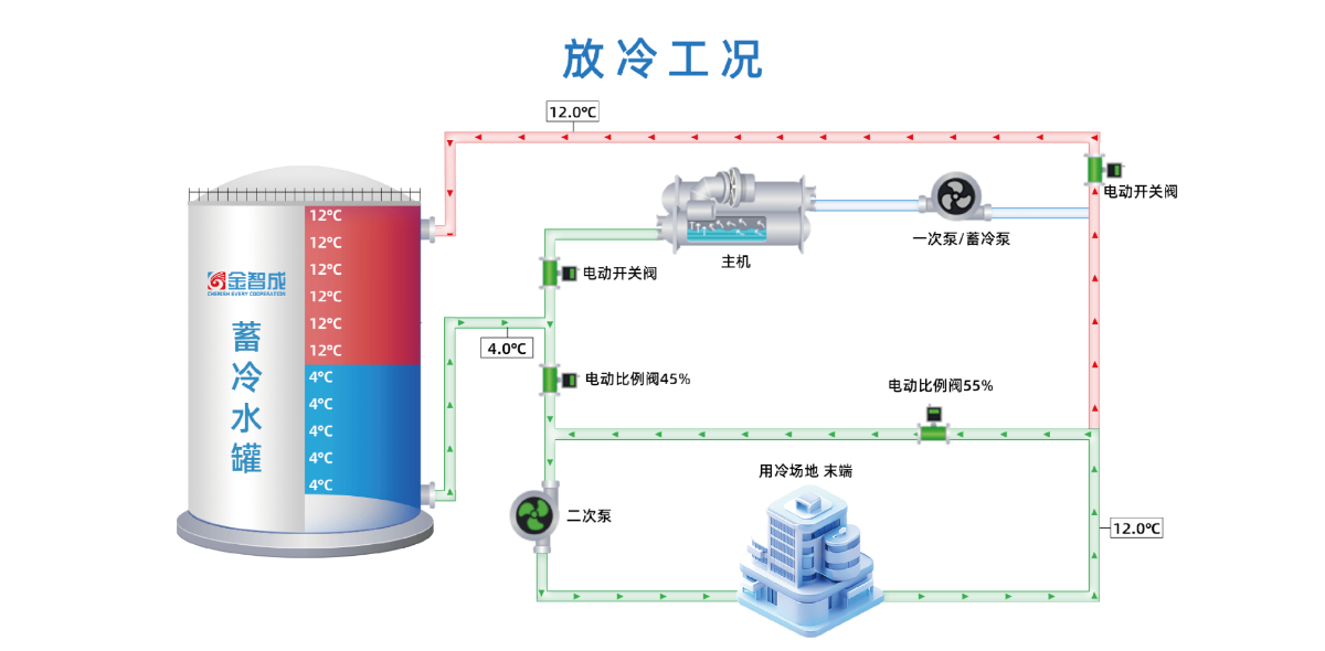 放冷运行模式:在白天高峰电价时段,尽可能采用夜间低谷电价时段储存的冷冻水,开启放冷管路的相关阀门,将蓄冷装置中的冷水抽出混合后,供给空调末端设备。