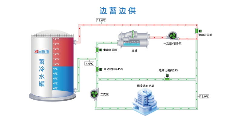 边蓄边供运行模式:制冷机组在蓄冷时段一部分制冷量用于满足当时的空调负荷,另一部分用于蓄冷。例如,在夜间低谷电价时段,制冷机组一部分制冷量用于维持建筑物内的低温环境,满足夜间少量的空调负荷,另一部分制冷量则用于将蓄冷水池中的水温降低。