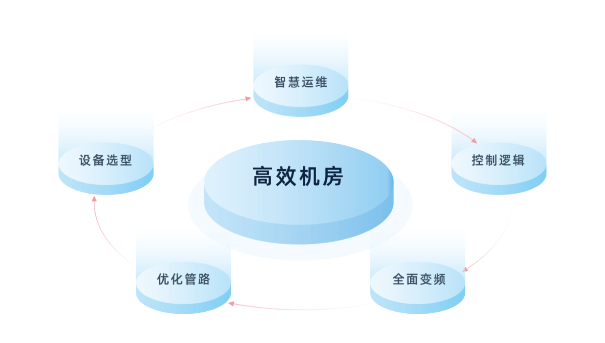 高效机房并不是一样全新的事物,它是贯穿了中央空调冷热源设计、施工、调试、运维全过程的一站式解决方案,主要措施包括选用高效设备提升效率、全面变频增加调节能力、优化管路减少输送能耗以及引入控制适配运行逻辑。