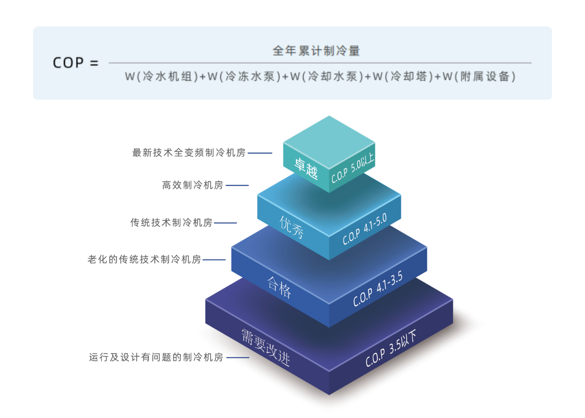 高效机房以机房全年综合能效比COP5.0作为评定标准,COP等于全年累计制冷量除以主机、水泵、冷却塔等机房设备的全年累计耗电量。