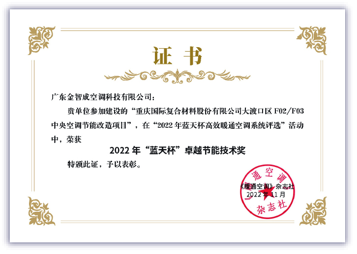 作为专注暖通空调系统实际运行能效的公益活动,“蓝天杯”高效暖通空调系统评选活动(下文简写为“蓝天杯”)自2019年开始已经举办了4届,前3届只限于高效机房(含能源站),去年的第4届扩展到高效系统。其中,广东金智成空调科技有限公司经过初期申报“重庆国际复合材料股份有限公司大渡口区”项目,自主公示和民意调查后,最终荣获“优秀工程”荣誉。