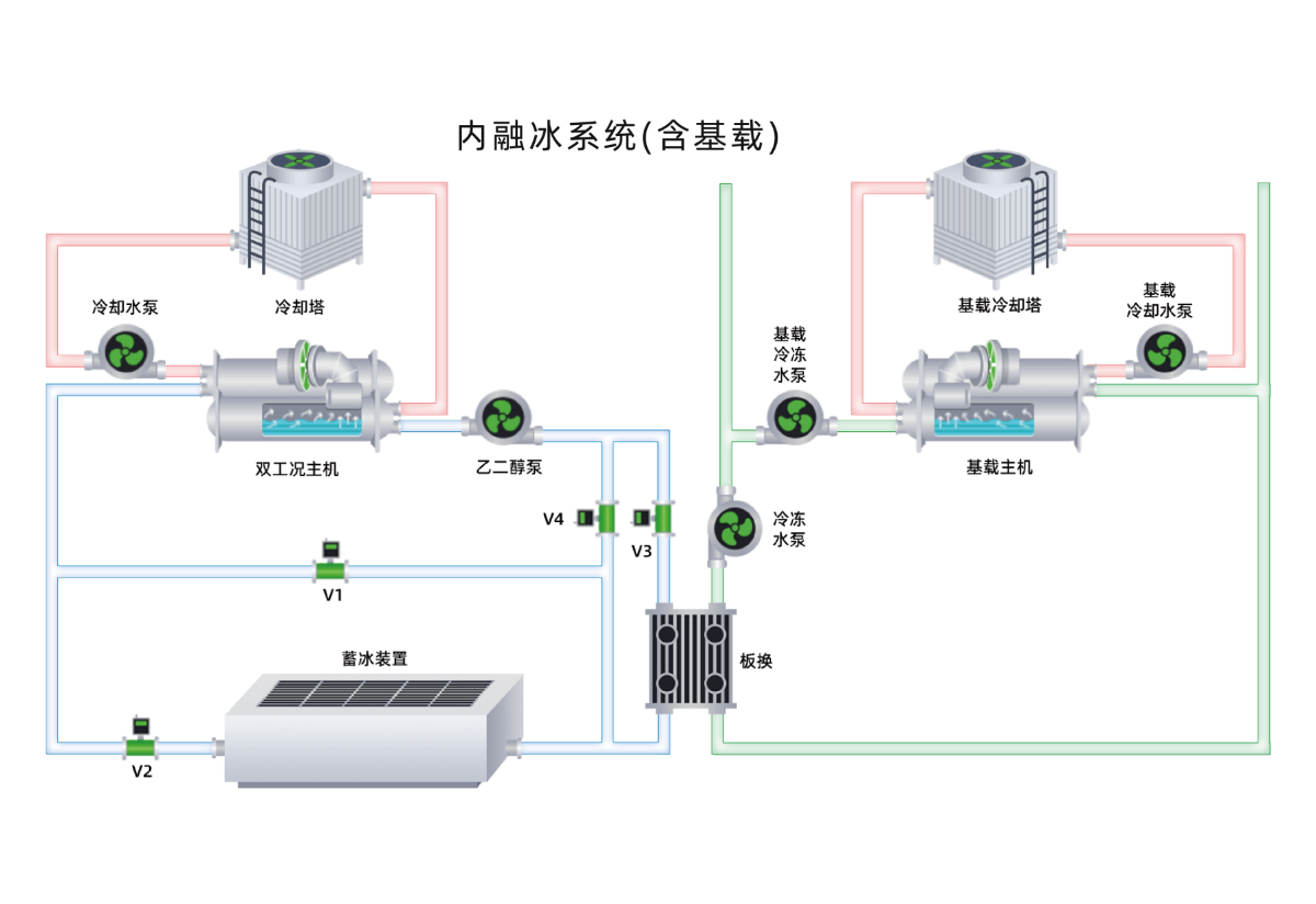 采用同一台主机白天制冷(5℃~10℃),夜间制冰(-5.6℃~0.6℃),这样可以显著降低系统的初投资,这样的主机也叫双工况主机。